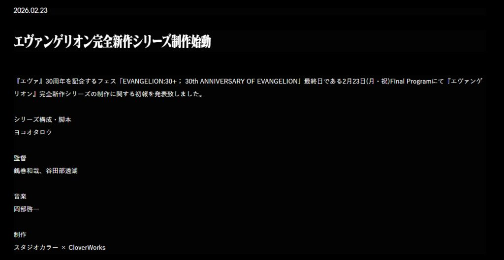 在纪念《EVA》30 周年的庆典活动「EVANGELION:30+;30th ANNIVERSARY OF EVANGELION」最终日 ——2 月 23 日(周一・节假日)的 Final Program 环节中,官方正式公布了《新世纪福音战士》全新系列动画的制作消息。